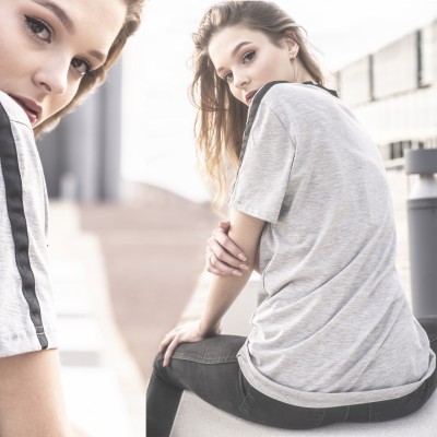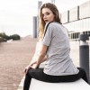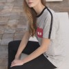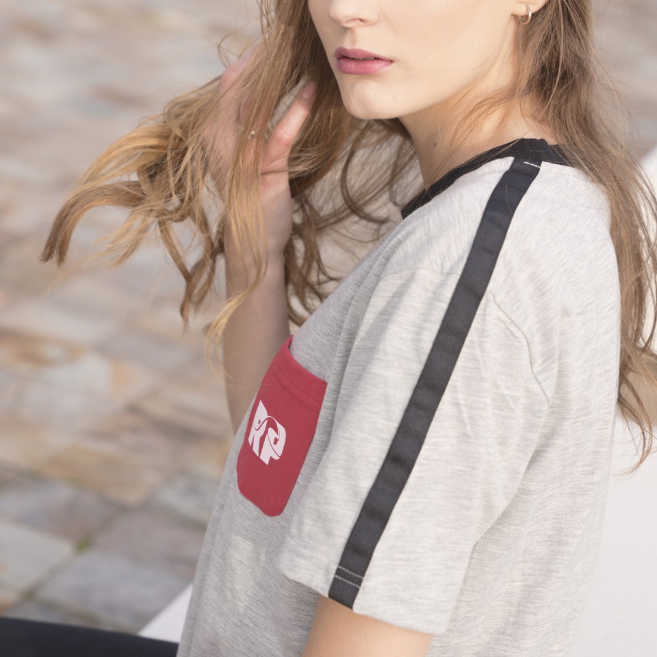 Camiseta gris mezcla con banda negra cosida en manga y hombro, con bolsillo en rojo bermellón.