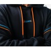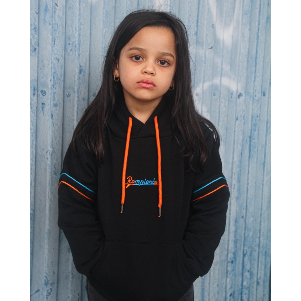 Sudadera kids negra, acentuada por su llamativo logo con detalles de líneas en vibrantes tonos de naranja y azul.