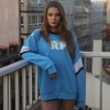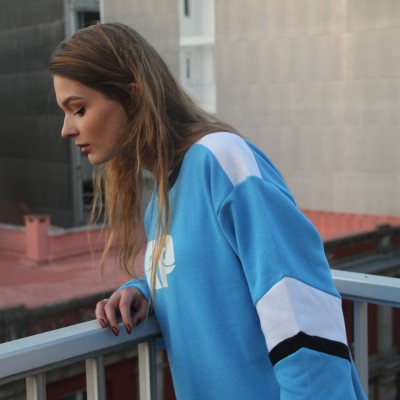 Sudadera sin capucha en color azul con detalles en blanco y negro.