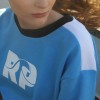 Sudadera sin capucha en azul, con el logotipo de Rompiente serigrafiado en blanco y franjas negras y blancas en las mangas.
