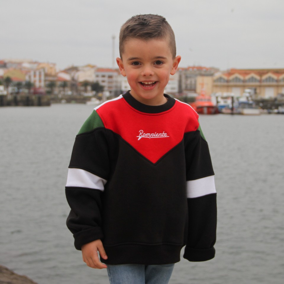 Sudadera Sin Capucha y cuello Redondo. Formada por 4 colores, Principalmente Negro y Rojo Con detalles Verdes y Blancos. Está inspirada en la Cultura Urbana acompañado de un  Diseño vanguardista.