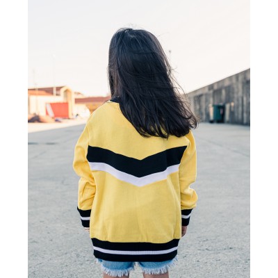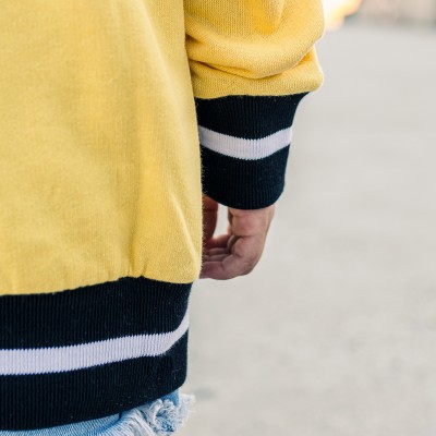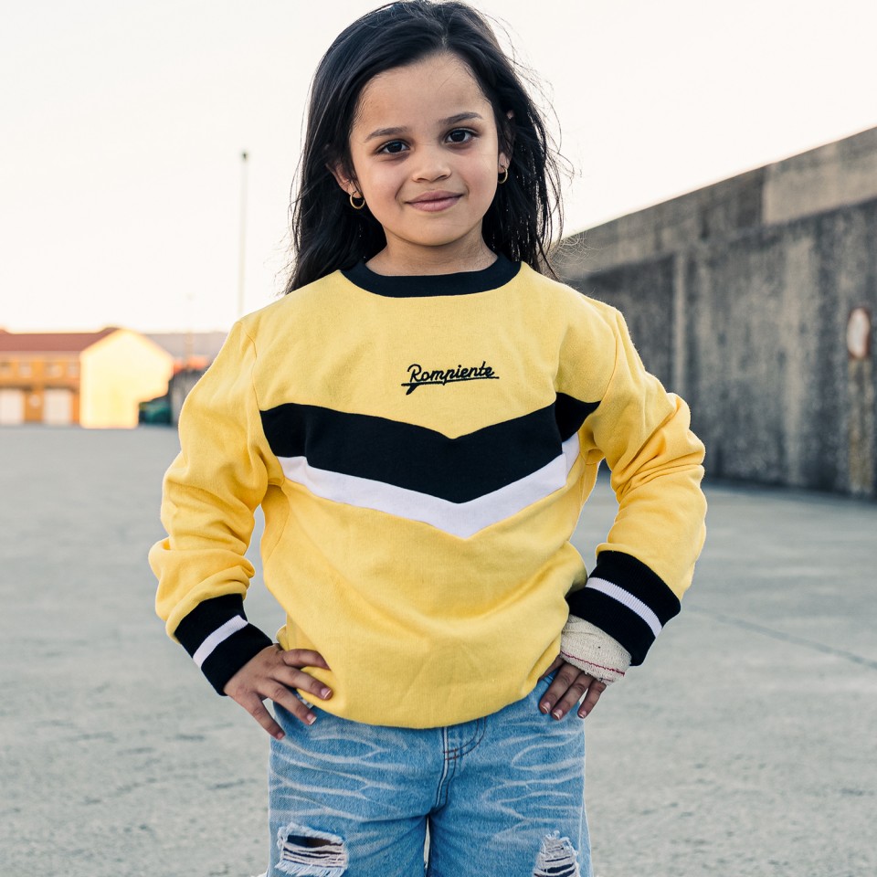 Sudadera sin capucha en vibrante color amarillo, resaltada con el logotipo Rompiente bordado en negro y franjas diagonales en blanco y negro.