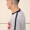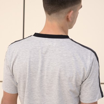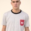 Camiseta gris mezcla con banda negra cosida en manga y hombro, con bolsillo en rojo bermellón.