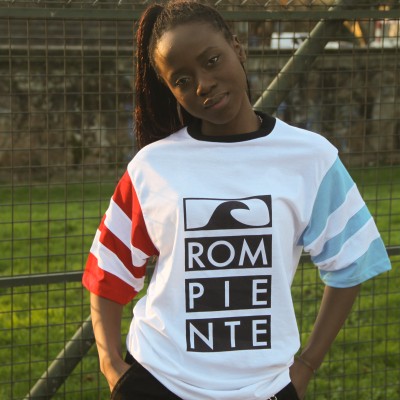 Camiseta de tiras de color blanco roto con motivos de vans surferas clásicas y palmeras, sublimadas en color azul turquesa. Tela mezcla de 10% Algodón - 90% polyester con cuello redondo abierto por delante y por espalda y etiqueta cosida con logo de RP.